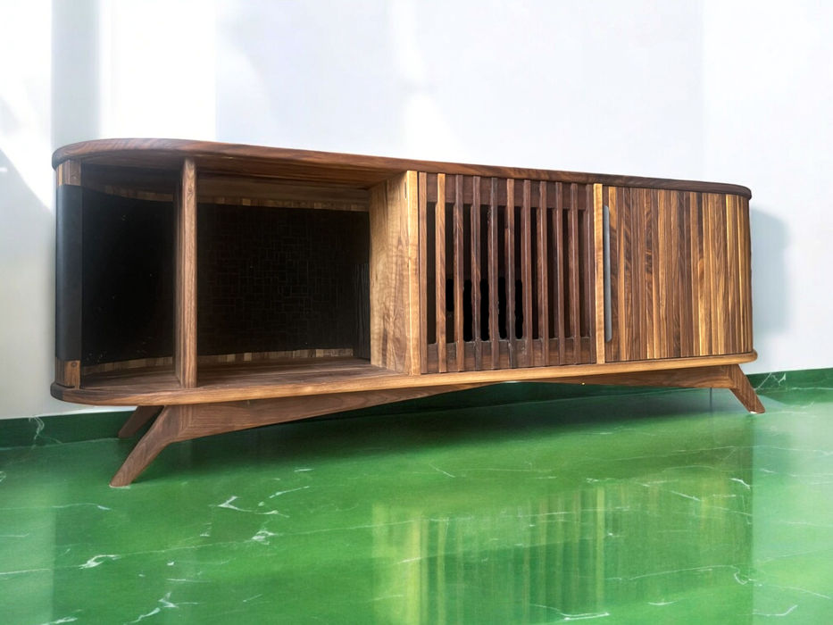 Découvrez ce fantastique meuble télé fabriqué en noyer noir pour une touche d'élégance et de robustesse. Admirez les 2 magnifique portes rideaux un détail qui témoigne de la qualité de la fabrication. Une porte ajourée au centre permet de mettre des appareil electronique. Ce meuble offre un espace de rangement généreux avec ses gigantesques 2 portes, parfaites pour dissimuler vos appareils électroniques et accessoires. Ajoutez une touche de sophistication et de fonctionnalité à votre intérieur avec ce meuble d'exception.
